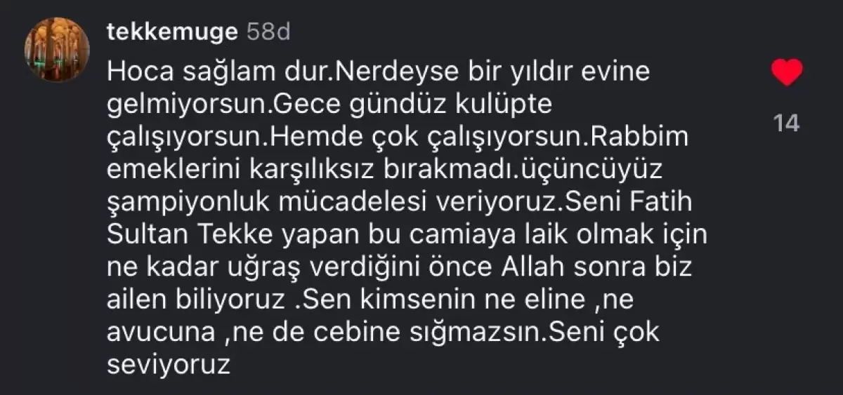 50 yaşındaki teknik adamın eşi Müge Tekke yaptığı paylaşımda, “Hoca sağlam dur. Neredeyse 1 yıldır evine gelmiyorsun. Gece gündüz kulüpte çalışıyorsun. Hem de çok çalışıyorsun. Rabbim emeklerinin karşılıksız bırakmadı. Üçüncüyüz. Şampiyonluk mücadelesi veriyoruz.