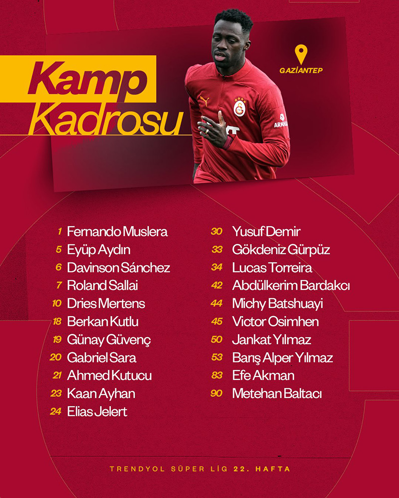 Galatasaray’ın Gaziantep FK maçı kamp kadrosu şöyle: