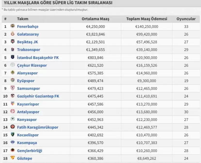 Galatasaray, Fenerbahçe ve Trabzonspor’un ardından puan tablosunda 4’üncü sırada bulunan İzmir temsilcisinin futbolcularına yıllık ortalama 360 bin 386 Euro ödediği belirtildi.