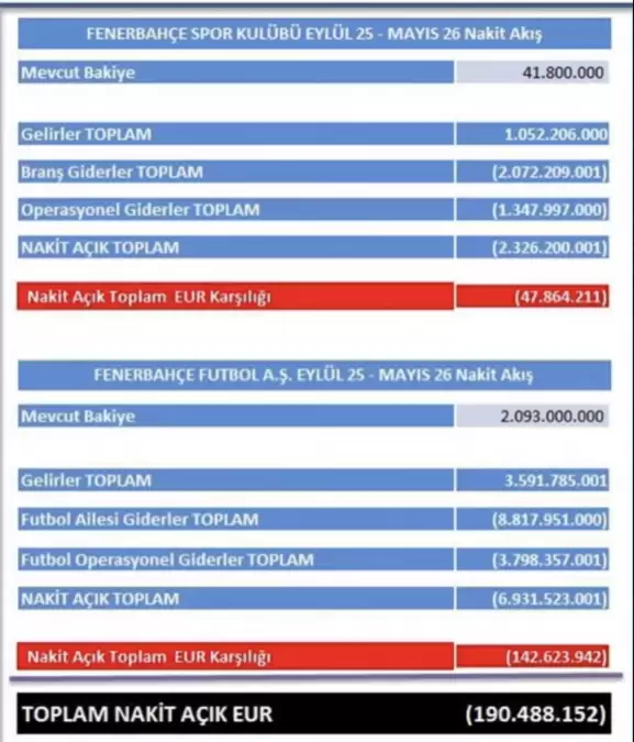 Takımın finansal olarak iyi yönetildiğini ve basına yansıyan spekülasyonların art niyetli olduğunu belirten başkan vekili, “Ekim 2025 Mayıs-2026 arasındaki Fenerbahçe’nin nakit akış tablosu eksi 190 milyon euro. Biz bunu bilerek geldik. Biz bu süreci yönettik ve 4.5 aylık süreçte ödemelerde hiçbir gecikme yaşanmadı. Bunlar konuşulmazken, suni gündemler yaratılarak alakasız konular camianın önüne seriliyor. Kritik bir maç öncesinde camiayı tekrar kasvetli havaya sokmaya çalışmak, belirli sosyal medya kullanıcılarının zarar vermeye çalıştıkları bir süreç.” dedi.