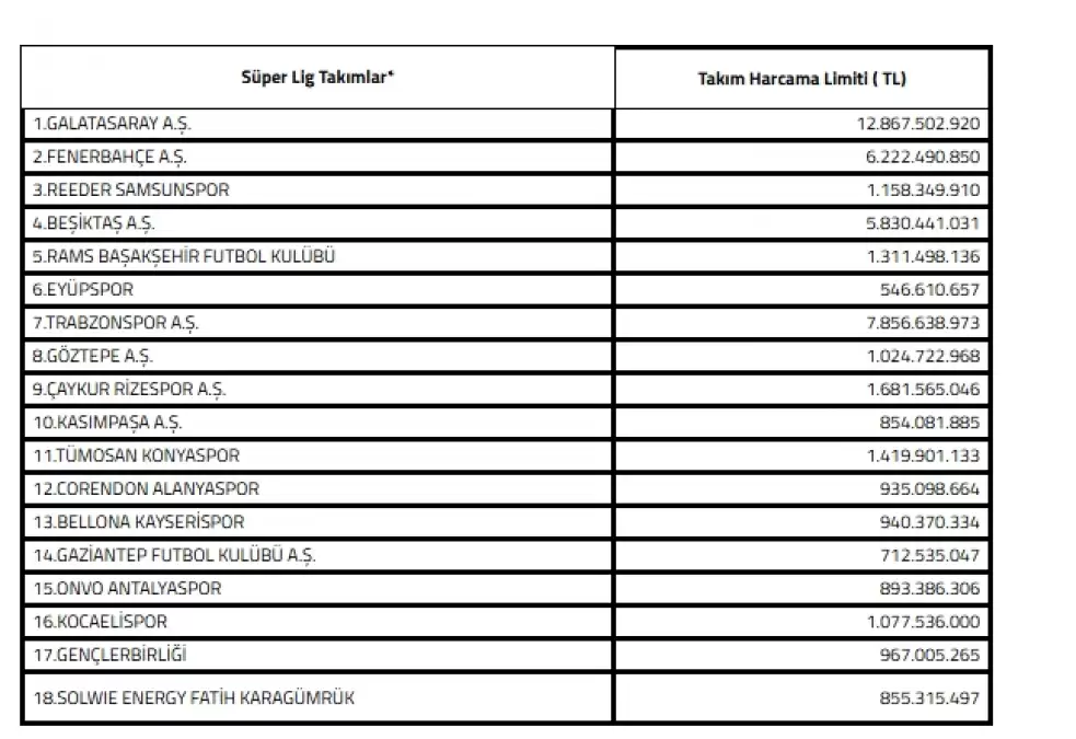 30 Aralık 2022 tarihinde yürürlüğe giren Kulüp Lisans ve Finansal Sürdürülebilirlik Talimatı’nın 121. Maddesi kapsamında, Ek XIII’de yer alan usullerle belirlenen Süper Lig Takım Harcama Limitleri şu şekilde hesaplandı” denildi.